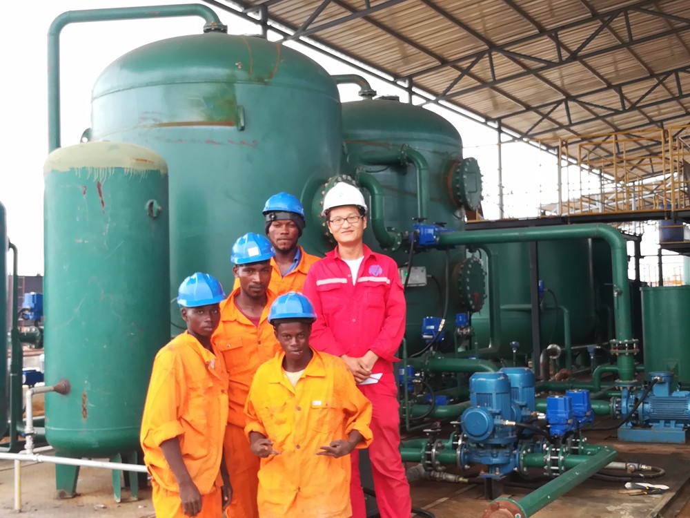 公司于2017年8月正式啟動該項(xiàng)目,2018年2月設(shè)備運(yùn)達(dá)剛果布佳柔油田,經(jīng)過長達(dá)四個月的現(xiàn)場調(diào)試水質(zhì)達(dá)到公司預(yù)期要求。處理后水質(zhì)各項(xiàng)數(shù)據(jù)均高于當(dāng)?shù)卦弥玫奶幚硇Ч俜种笥遥以O(shè)備采用物理法水處理方式,不加藥,運(yùn)行成本低,污染小,效果好,受到客戶高度贊揚(yáng)。